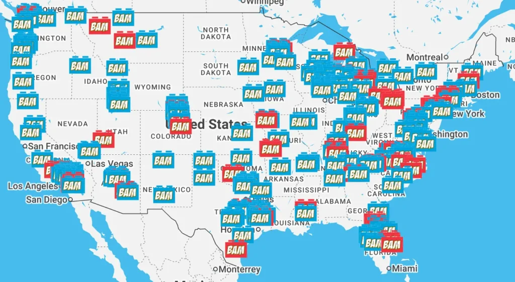 Bricks & Minifigs (BAM) is the original LEGO®-authorized reseller for buying, selling, and trading new and used LEGO® sets, minifigures, and accessories. Founded in 2010, their franchise locations throughout the United States and Canada have exploded with 200+ sites (red sites are “Coming Soon”).